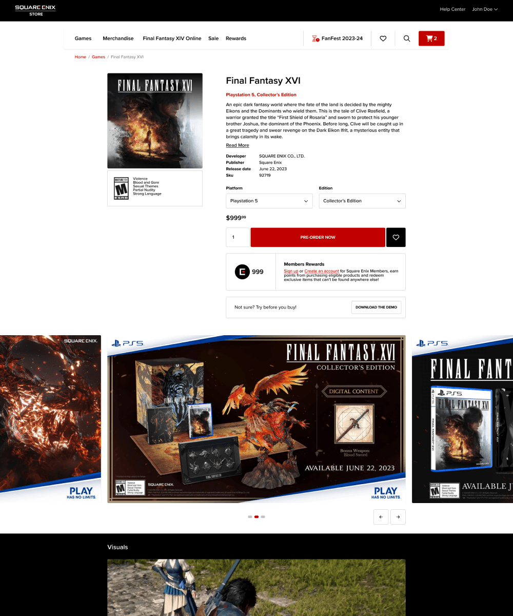 This platform had to excel at two things: showcasing premium collector products through rich merchandising, and staying launch ready when demand spiked instantly. It supported highly anticipated Final Fantasy XIV expansion releases, including real time announcements during large industry events, so flexibility and launch readiness were core requirements from day one. Beyond the core store and full post purchase ecosystem, it included advanced features such as 3D visualization and a full loyalty program with points, rewards, and vouchers. Over more than ten years, it evolved through three full versions while maintaining continuity for returning customers.