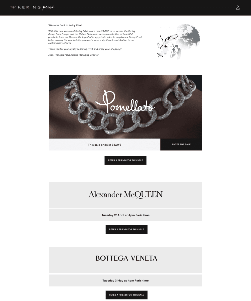 A gated private sales platform for employees and invited guests, built around limited time drops across multiple luxury brands and intense stock contention.